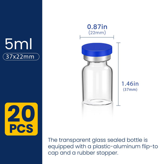 5ml Sterile Vials with Self Healing Injection Port and Sealing Cap, Glass Sterile Vials for Injections (20 Pack)